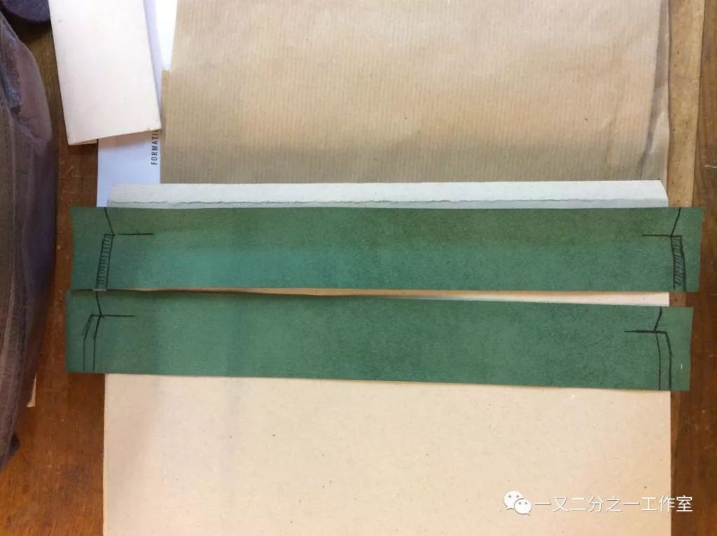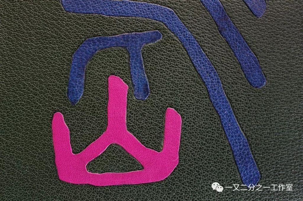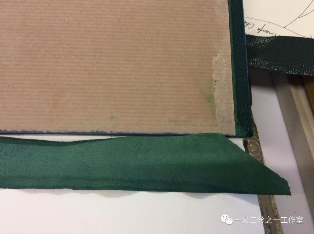 在这本书中,我第一次尝试内书槽贴皮工艺,法语中被称为“合页”(charnière)十分贴切,因为是在翻开封面后所能看见的环衬折口处贴一层极薄的皮革,如同大门的合页,贴皮通常与封面皮革同色,形成分别独立的环衬两侧,封二像画框一样,有时还会有复杂的手工装饰图案,形成优雅精致的装饰效果。
