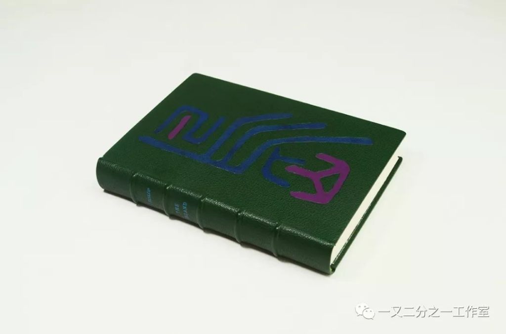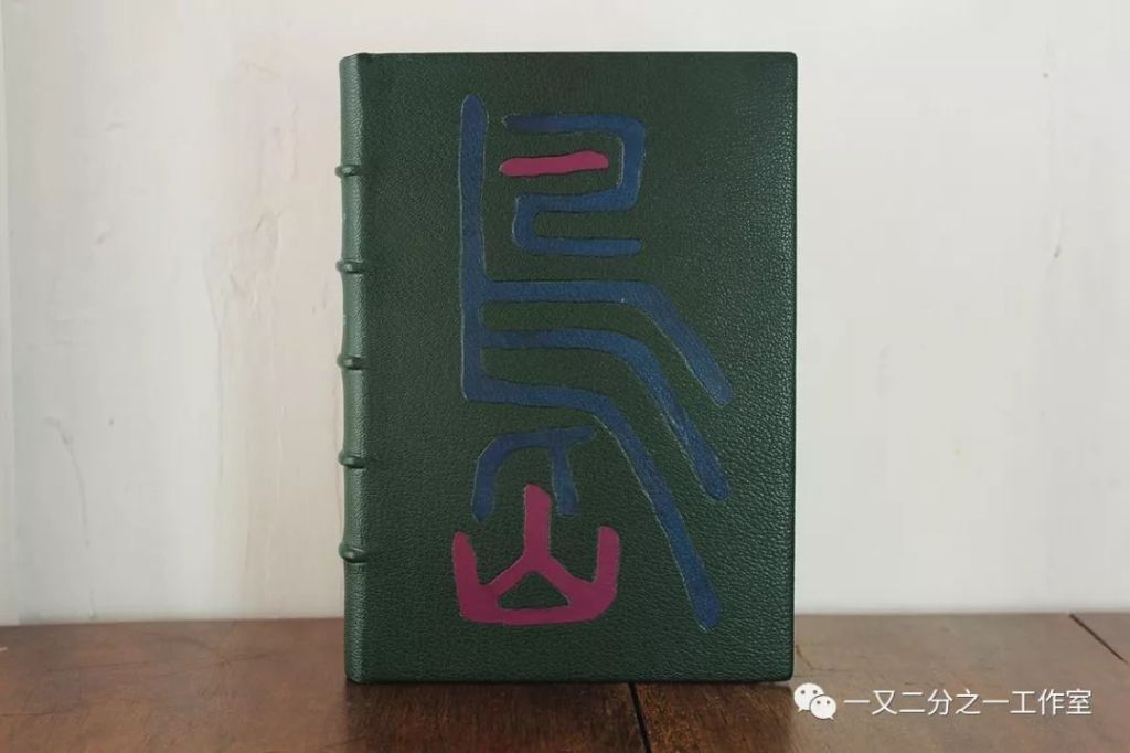 深绿色Chagrin山羊皮全皮革精装,最终选择的二色贴皮是山羊皮和绵羊皮,在“岛”字中分离出“一山”的形象。
