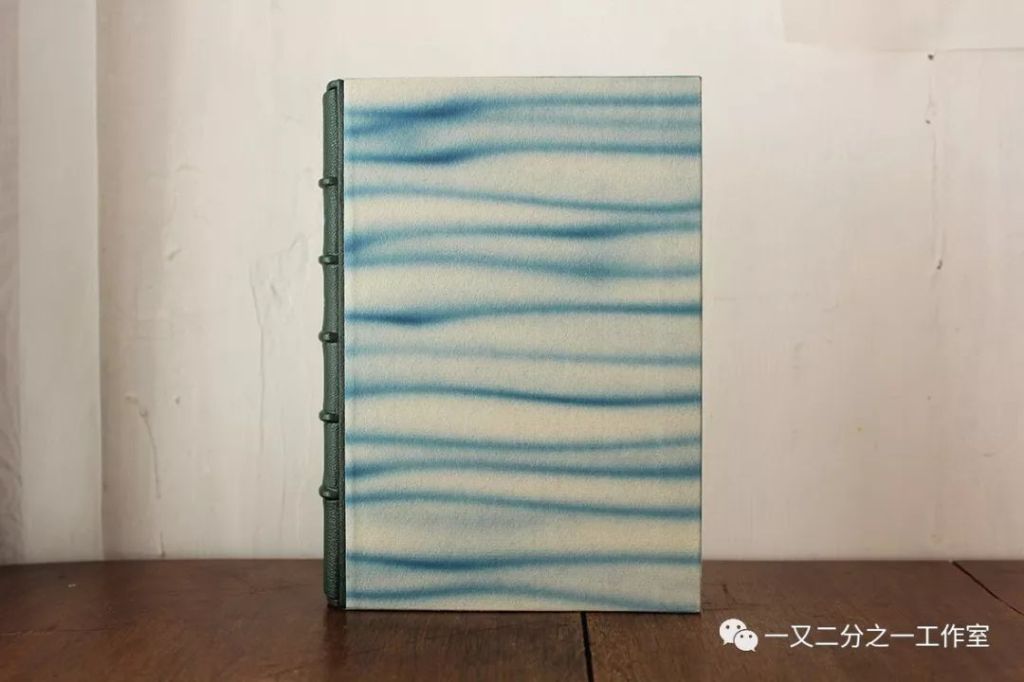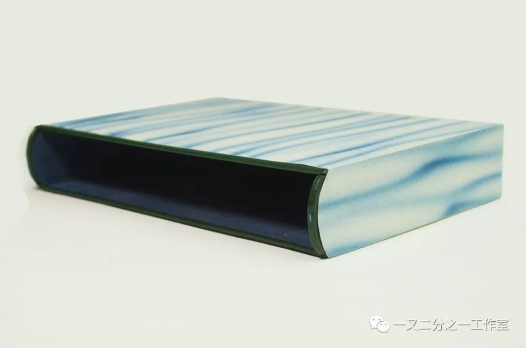 最后,我为这本书做了一件书函,圆口书函“量身定做”,能够严丝合缝地配合书本形状。封面同色皮革包边,全裱色调明快的蓝色水纹手工纸,内衬柔软的深蓝色麂皮,为了更好地保护书籍封面。取书的时候,仿佛斯皮纳龙格岛摆渡人从一望无际的平静海面远望,森林小岛渐渐映入眼帘,越来越近,心中浮现妻女的面容,近在咫尺,却再也无法亲近。
