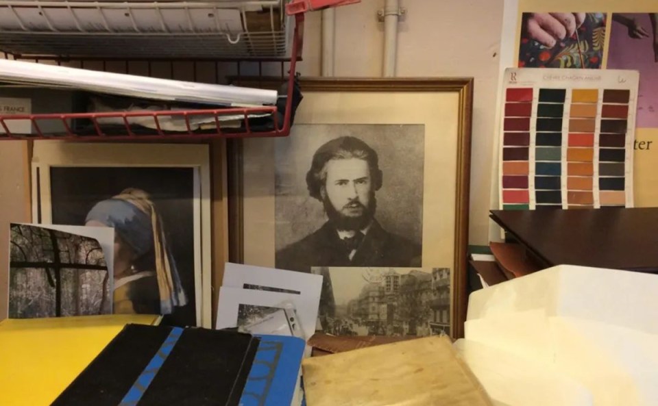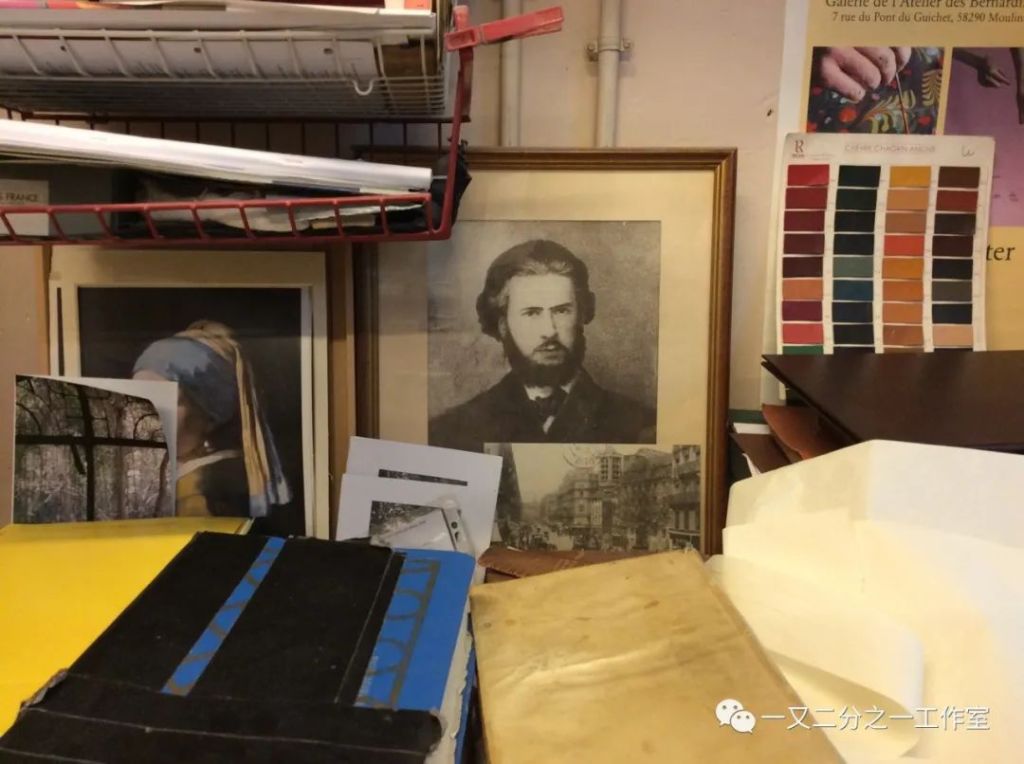 说装帧工坊Atelier des Bernardins(伯纳德街工坊的凯瑟琳)“乱而有序”,名副其实,在不常用的剪板机上,总是堆着彩色的文件夹、不知道什么时候拆下来的旧封面,用了一半的修复纸…… 《戴珍珠耳环的少女》旁边,立着另一幅青年男士肖像,刚到工坊不久,我就注意到他:“Catherine,这是谁呢?”