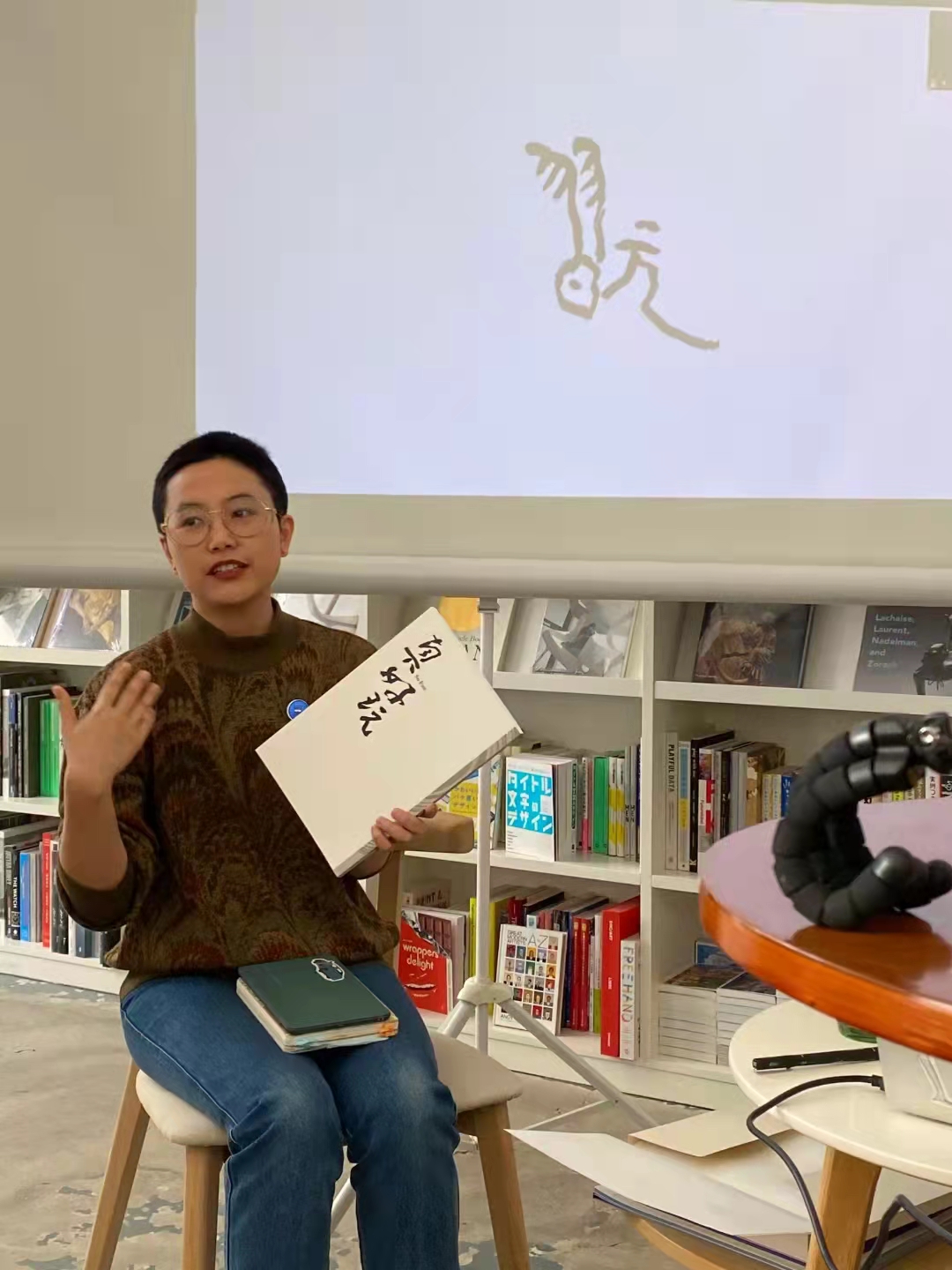 第二次跟两位的见面,心里有些忐忑。我和设计师劳硕维专程约吕旻详谈,结果被邀请到了吕敬人老师的工作室,这才得知,吕旻平时大部分时间在这里工作。我们一进门就被满屋子的书吓到了,连我这个还算见过不少书的书店店主都由衷感叹,在这里工作太幸福了!我和设计师都有些“不务正业”,开始仔细端详起书架上的书来,特别多都是绝版孤本,从中国传统文化,到国际一线设计作品;墙面上特别多非常有纪念意义,设计经典的海报,以及能看到很多熟悉的海内外设计师朋友的合影留念…温暖至极。