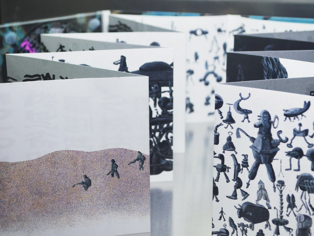 白 魁:初看接近6米长的《大迁徙》原作,被超大的体量所震撼。两年前,我和小龙花就开始着手编辑设计,去年七月已有完整样书,超大开本,呼应原作体量。小老虎在小龙花工作室看到这本书,并由此延伸出的音乐创作,是我们谁也没想到的。原本就打算在奇点艺术节发布一件mini《大迁徙》,内容有所简化,尺寸也跟着缩小,然而小老虎的加入,丰富了视觉以外的想象,绘画与音乐在我的设计中相遇。对我来说,mini《大迁徙》是正式版的诗意序章。