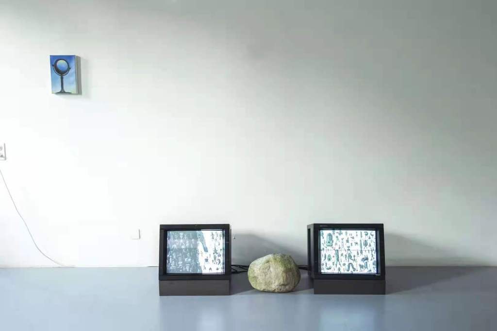 《大迁徙》绘画的部分通过网络完成了“瞬间移动”,以影像装置的方式在瑞士的《IMPORT⇄EXPORT/输入⇄输出》展出。展出前我与策展人一楳讨论借来了两台监控显示器来监视这场迁徙。布展时我请她从山里找来一块大小适中的石头,阻隔在两台平置于地面的显示器之间。