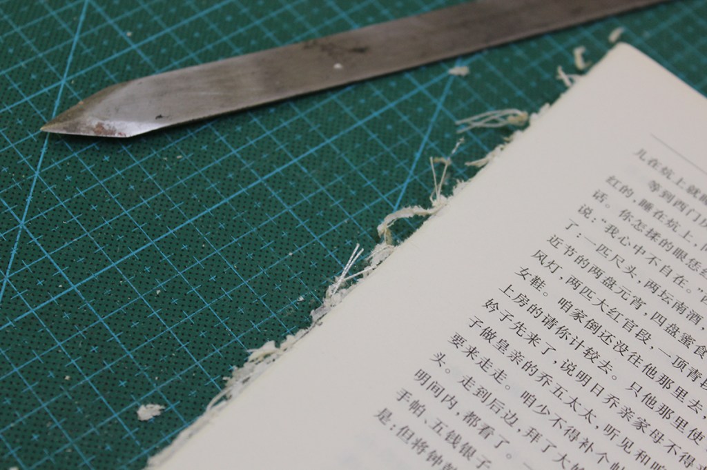 2021年5月,正式开始着手制作。原书是工厂制圆脊精装,所以先做了拆书、去胶,压平等基本工作。现代大机器生产书本时使用的胶粘性特别强,去除时比较费劲,并需要反复确认是否已经将孔洞中的残胶完全清除。