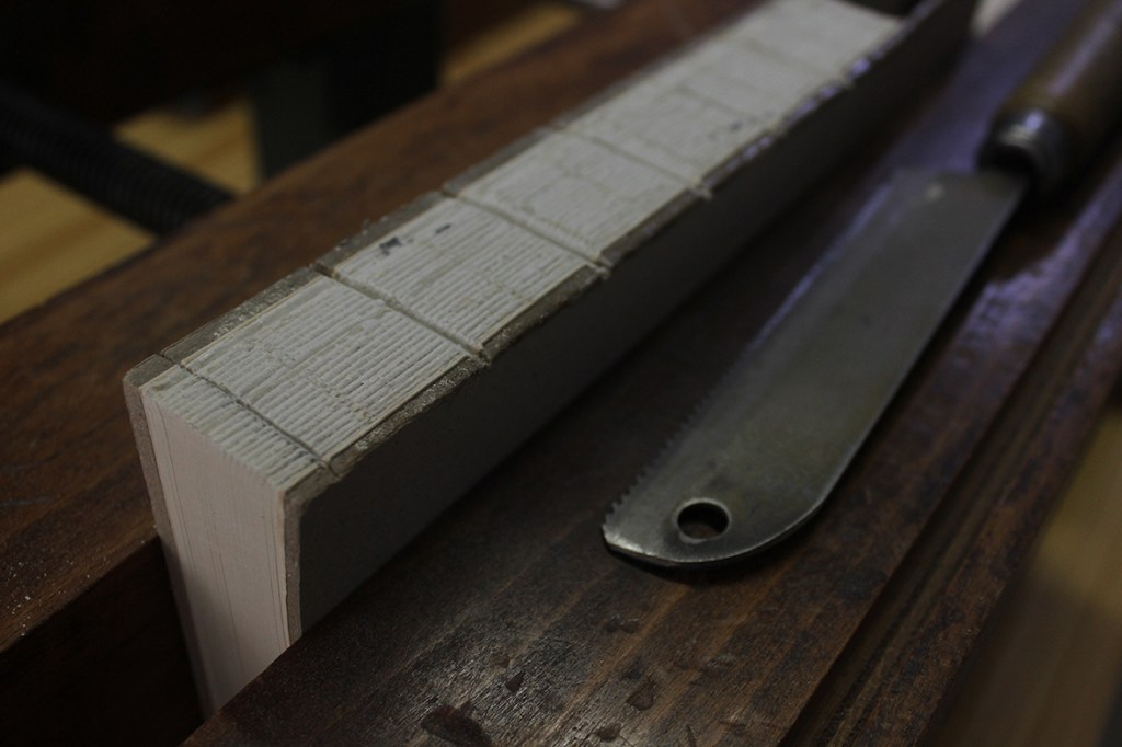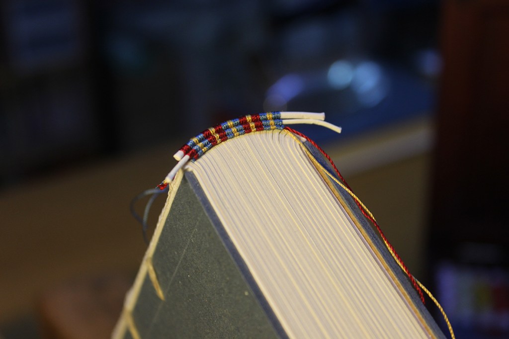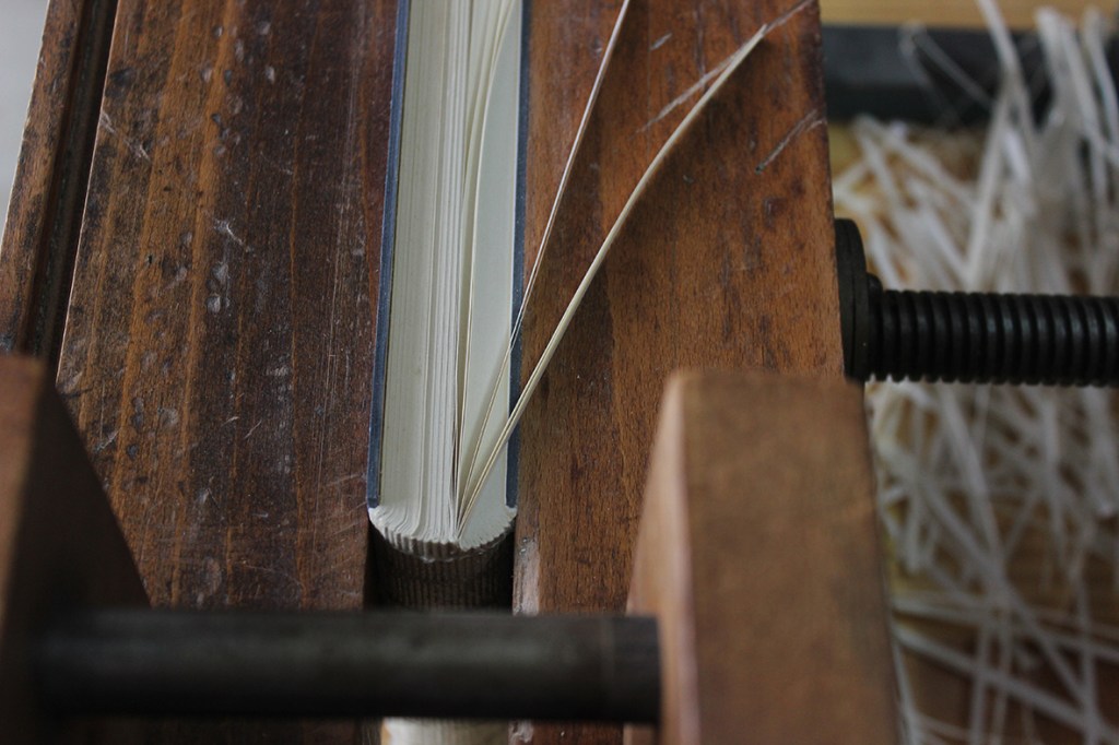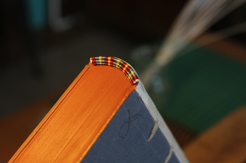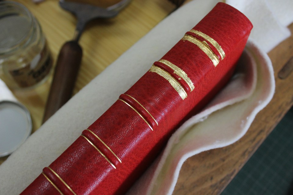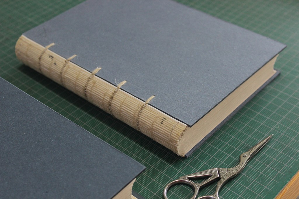 用丝线手缝笃头布后,裱纸加固书脊,粘皮革书筋,并将封面和书脊一同打磨修整。