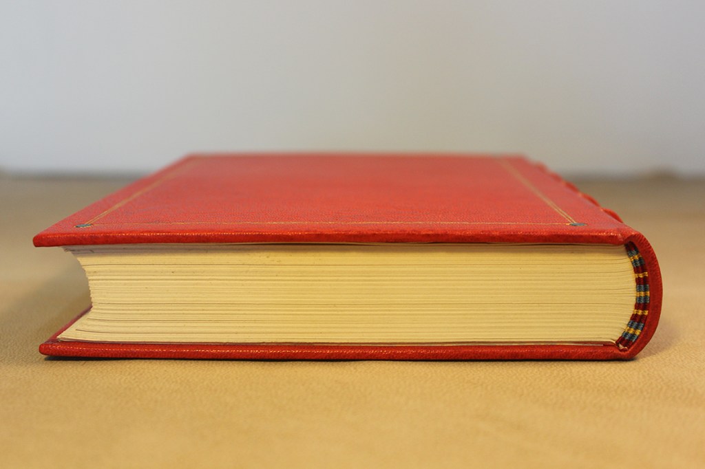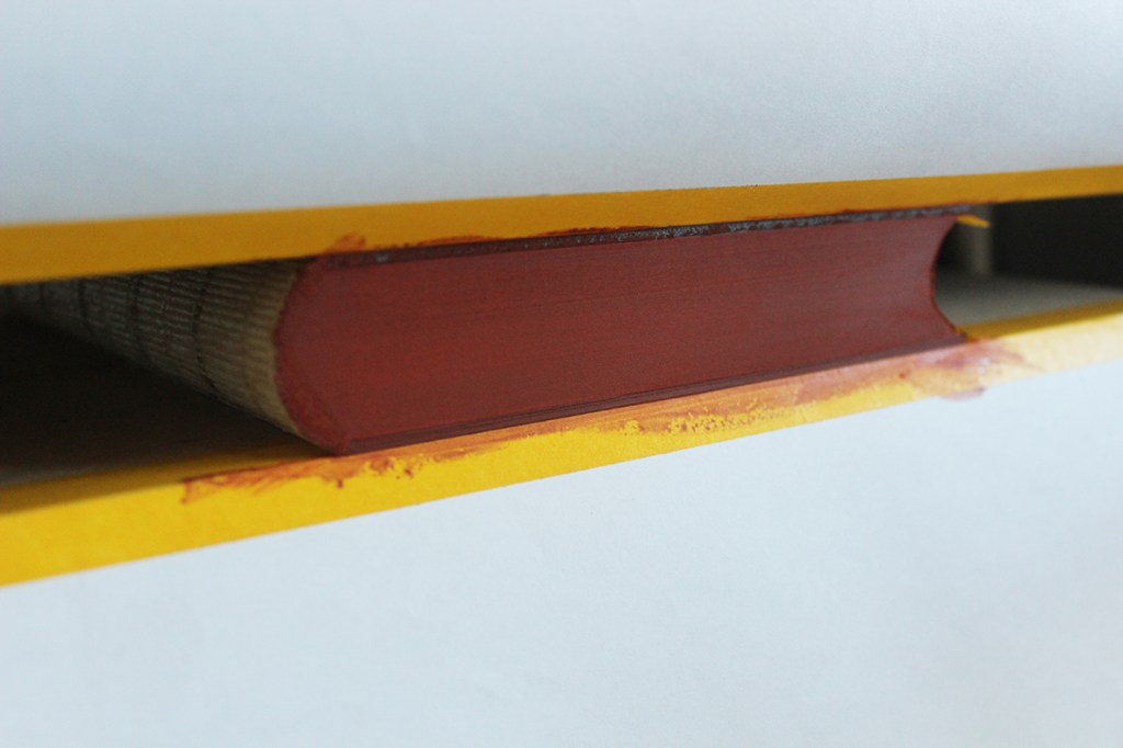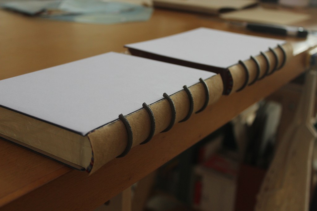 然后,根据选用麻绳的粗细在书脊锯五孔,用装帧麻线缝制,扒圆起脊。封面封底使用巴黎Relma的蓝色无酸板,在夹书机上刨平天头书口,再细打磨,刷砖红色。