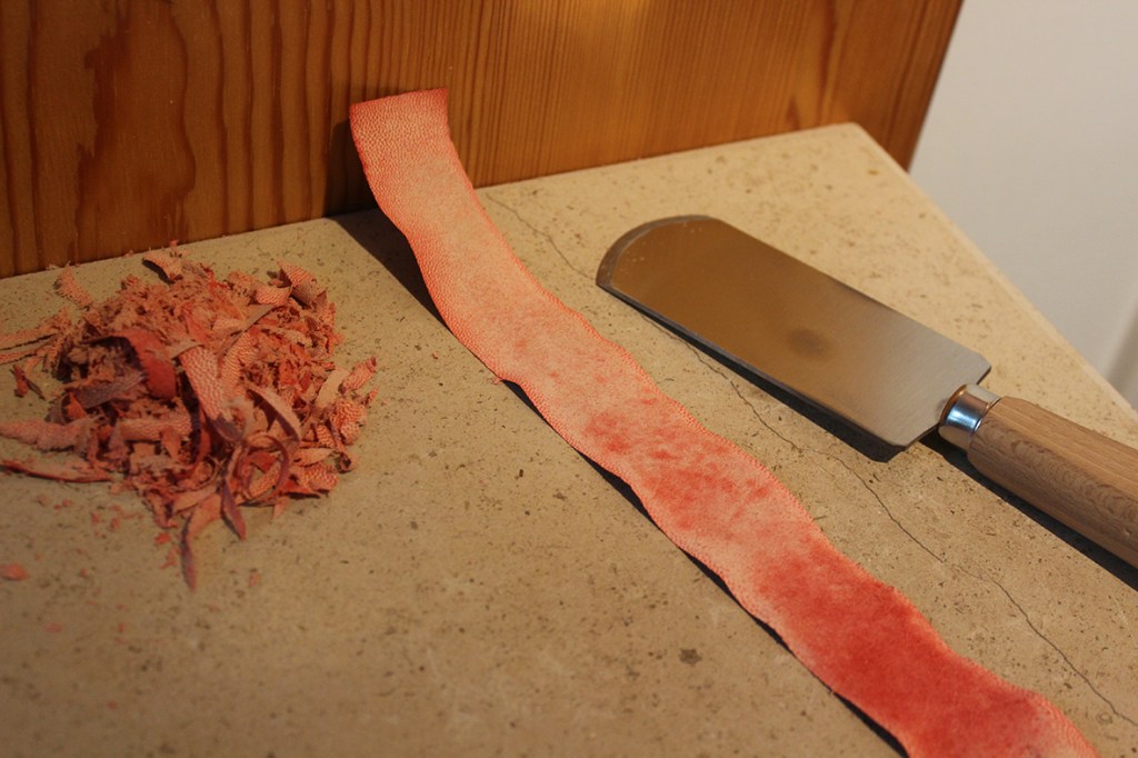 封面用皮是比利时百年品牌Norcuir的“绿洲山羊皮”(Oasis Goatskin),我一直喜欢这个名字,“红色绿洲”更显得意味深长。这是一种经过植鞣和苯胺染色处理的优质皮革,专门用来装帧书籍,色彩稳重,渗水性好,保留了清晰的表面纹路,手感极佳。做这套书消耗了将近一整张皮,最终效果比想象中还要好,连小小的原皮瑕疵都显得很有味道。