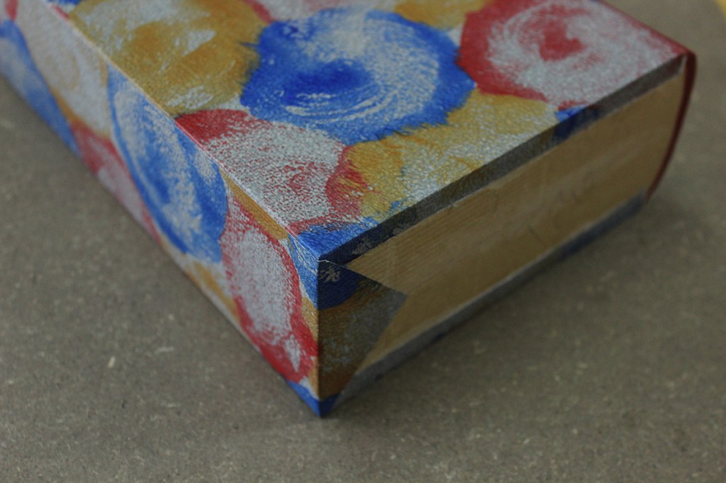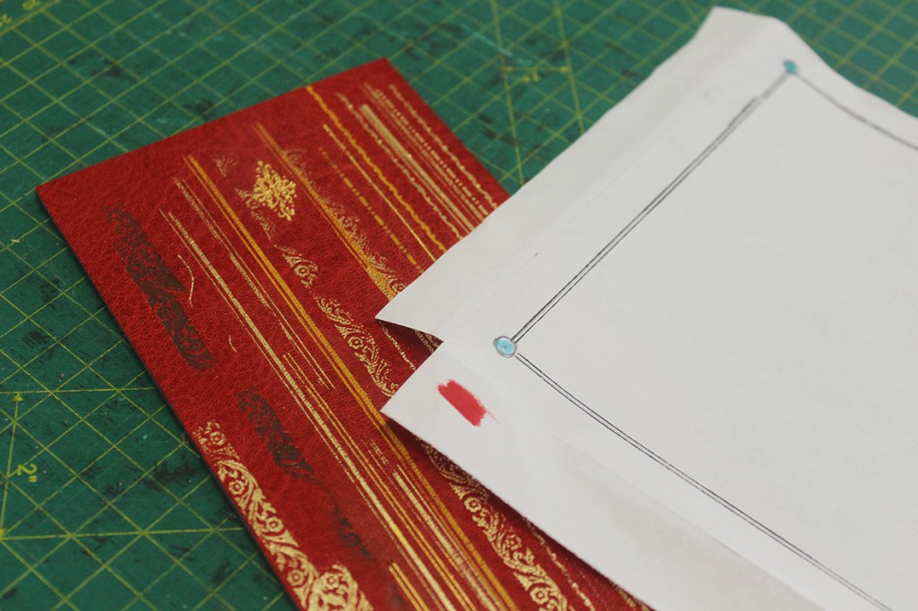 最后,还做了一个内衬红色绒面皮的函套,避免书本受损。函套裱纸使用同色系的手工印染纸,但图案较为抽象和现代,与书籍装帧形成有趣的对比,又不显唐突。