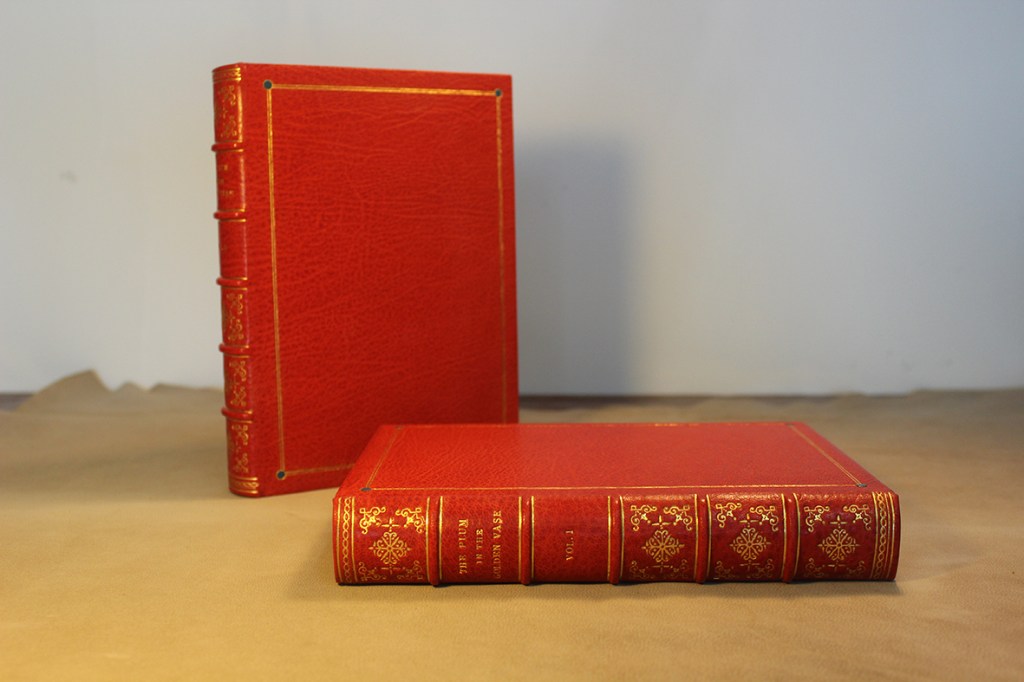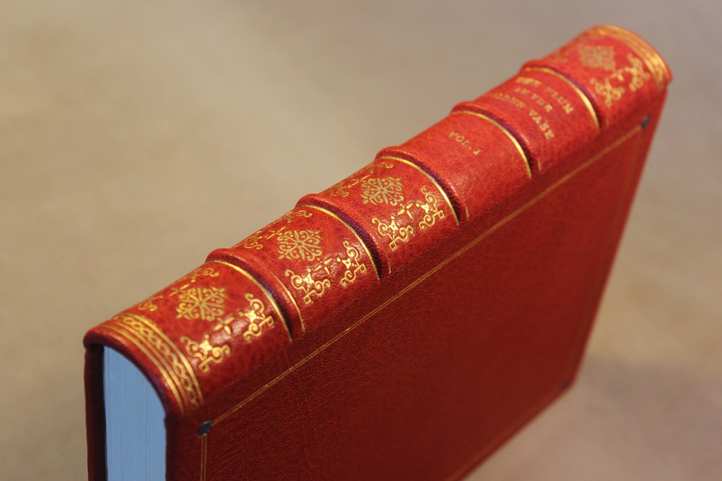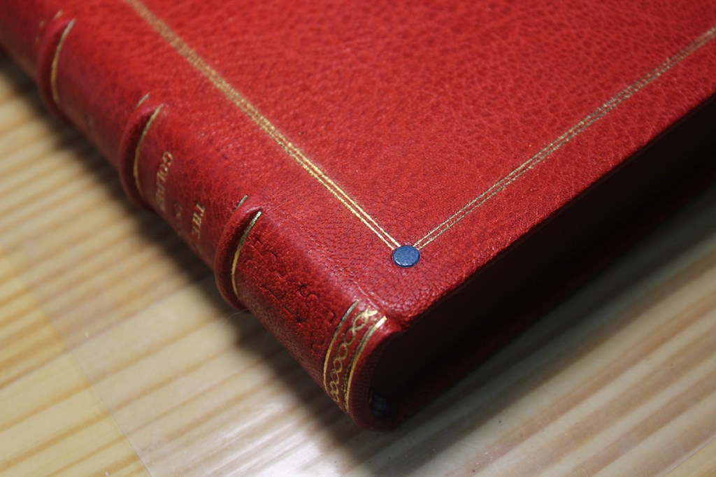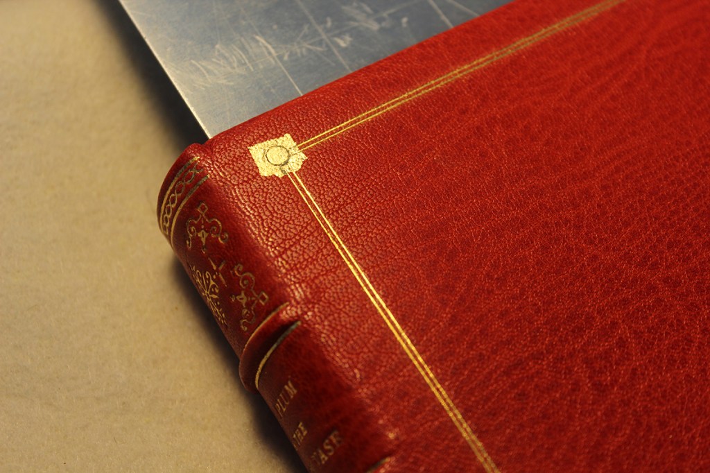 关于书名,几经商讨,最终做出了直接烫印英文的决定,因为我和客户都还是觉得英文标题跟整本书的古典气质更搭配。书筋之间的烫金图案是17世纪风格花纹,由订制的三个木柄工具组合完成。