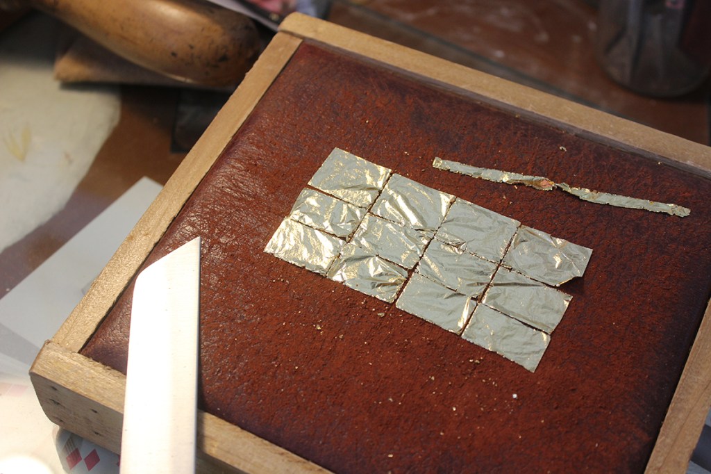 但由于“绿洲”比较硬挺,在使用真金箔烫金操作时,也遇到了不少具体的困难,所幸制作期间,刚好赶上Huhu老师在国家图书馆教学,得以及时请教,根据她的建议,我调整工作室湿度,也学到了高效的抛光办法,经过在试验板上反复演练,一点一点地完成了这本书的烫金和皮革镶嵌装饰,全过程历时一个月。