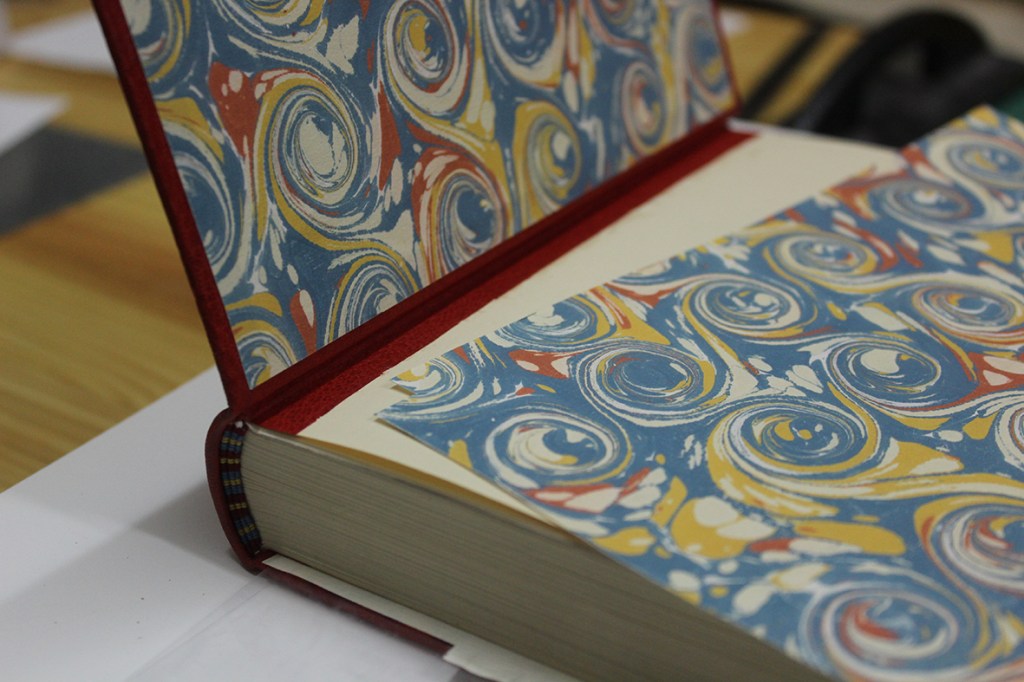 看环衬选用手工制作的法国大理石纹纸,色彩与封面皮革、堵头丝线等紧密呼应。这种始于17世纪,流行于18、19世纪的螺旋纹图案,非常经典,常能在古典装帧书籍中见到。