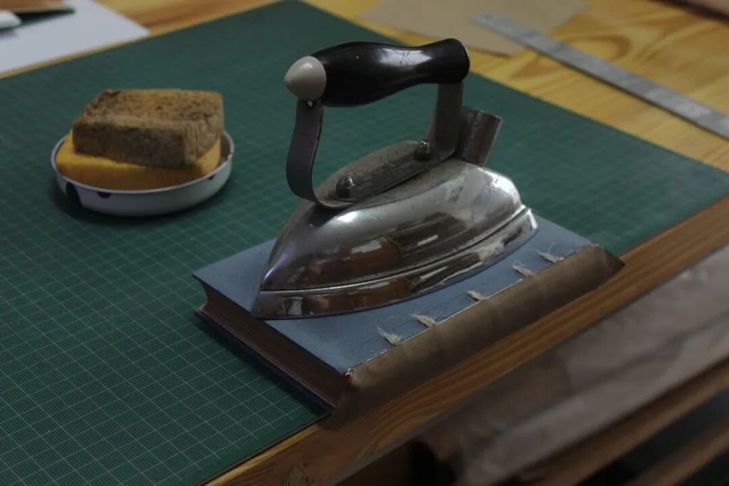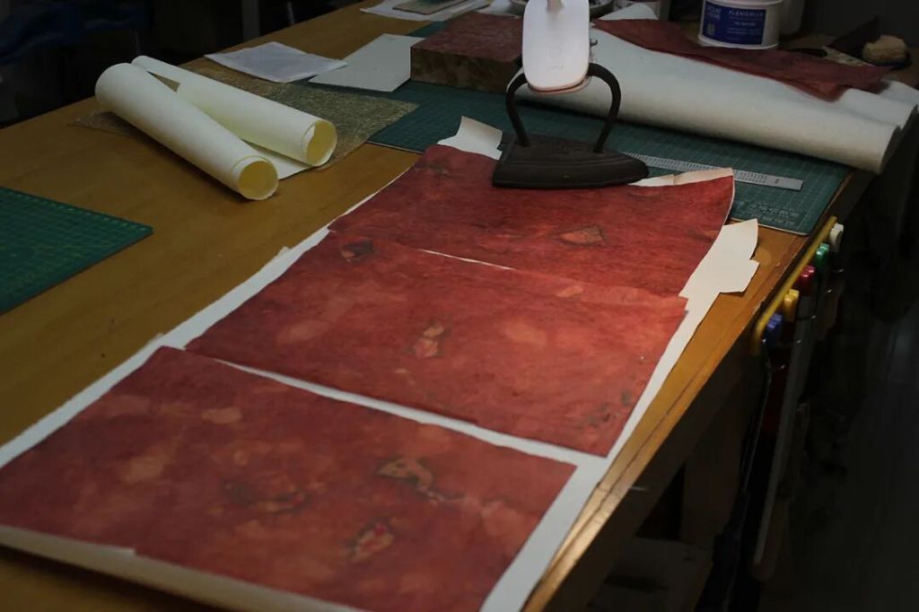 拆书和缝缀,是最基础的工作,在这个过程中,要仔细去除所有残胶,把哪怕是最细小的裂缝、破损都补上,此书品相较好,花费的工夫就相对少些。封面板是从法国采购的无酸蓝纸板,正适合这本全皮精装。