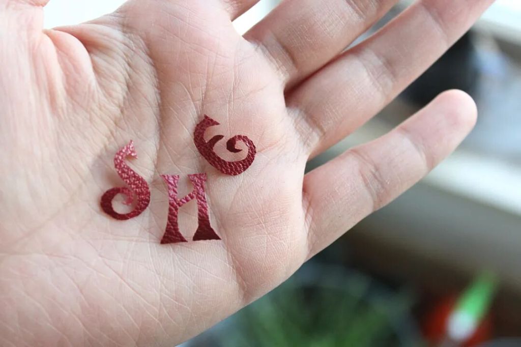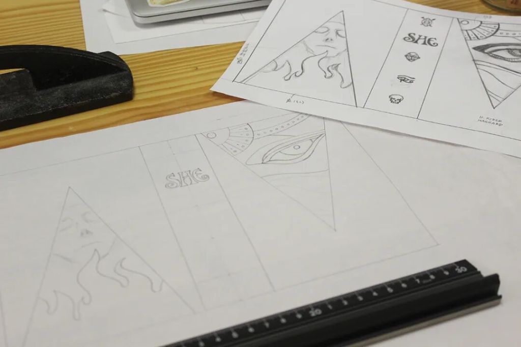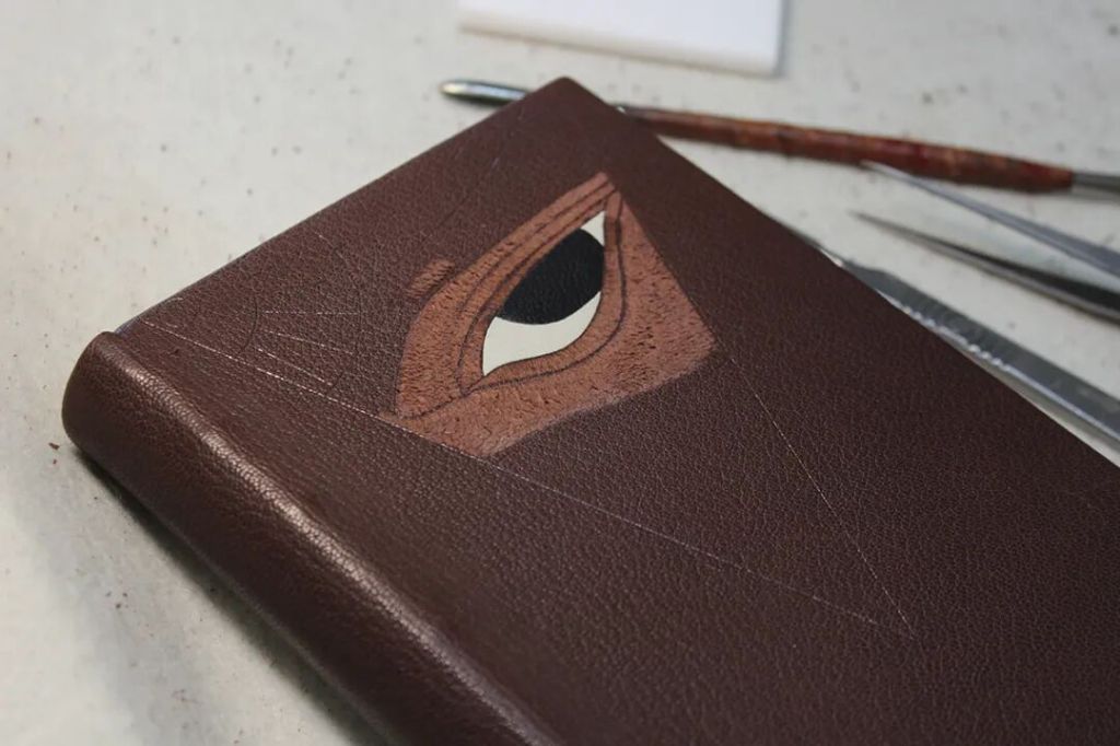 接下来是漫长的皮革装饰阶段,结合客户最初的设计构想和我所理解的故事情节,我又做了几种新的尝试,并最终确定了方案。封面和封底各有一个三角形图形,所有的镶嵌图案都在三角范围内:封面是倒三角锥形,中间露出”她“的一只眼睛,能看出这是位头戴冠饰,蒙着红色面纱的黑发女子;红色延伸到封底的三角形中,却成了火焰,火中隐约显现的面容,是金字塔中的亡魂。一本书,从封面翻到封底,女王在曾经给她永生不死的熊熊大火中,最终化作一具干尸。突出”眼睛“这一形象,源自客户最初的想法,我选择刻画一只左眼,不仅是以局部激发对女王美艳容颜的联想,也与古埃及文化中最令人印象深刻的符号之一”荷鲁斯之眼“不谋而合,古埃及人相信鹰头神荷鲁斯的左眼有使死者复活的力量。