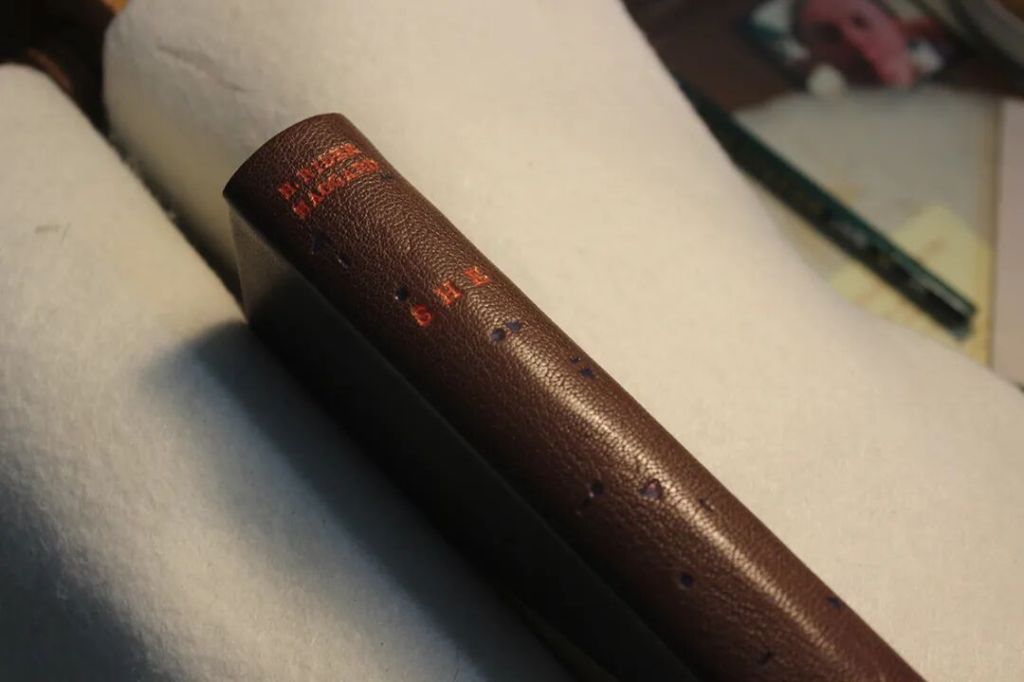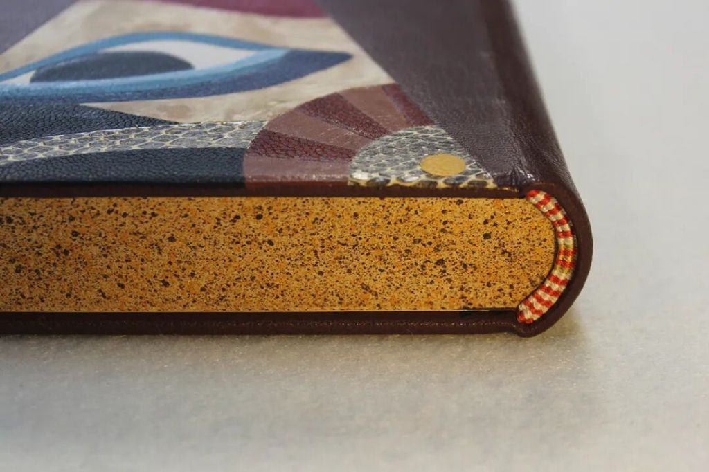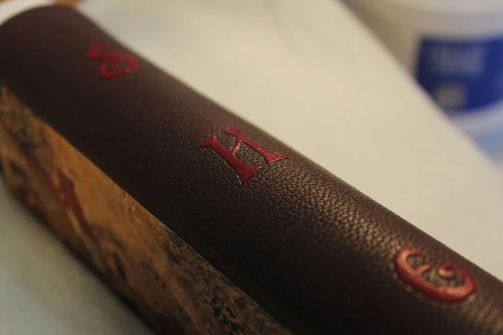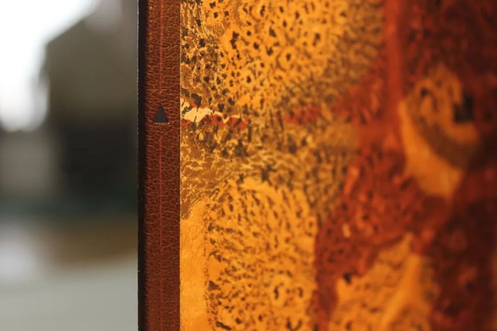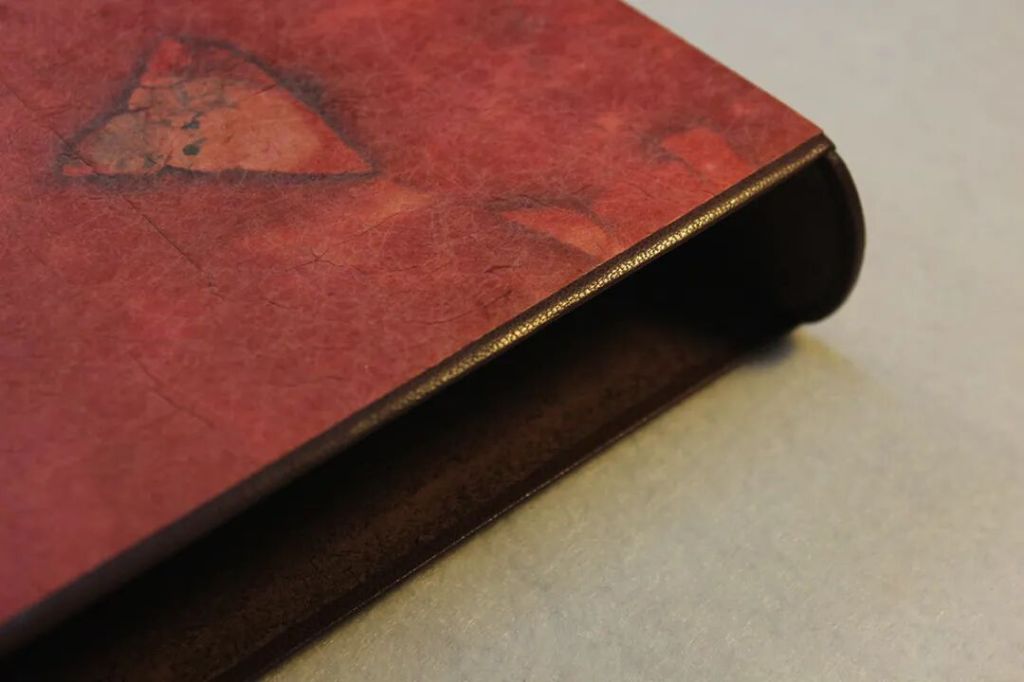 和人体一样,书的”脊椎“是结构中最重要的部分,因此书脊的处理总是费时费力:不断确认,不断打磨。紫褐色的山羊皮是我们一开始就选好的材料,包覆整个书脊和封面,“延伸”到内侧合页处,在封面封底内部形成边框,这也是一种比较精致的装帧形式,只在某些全皮精装中使用。