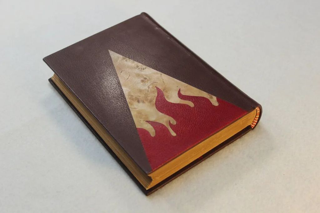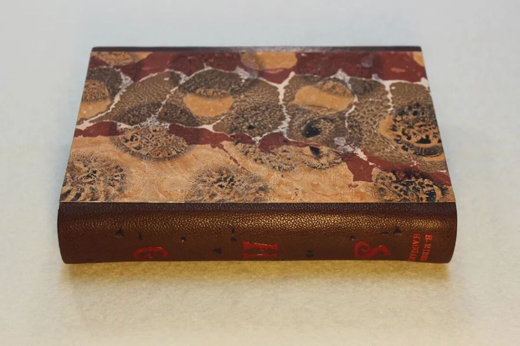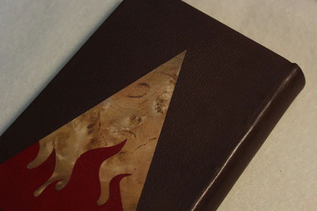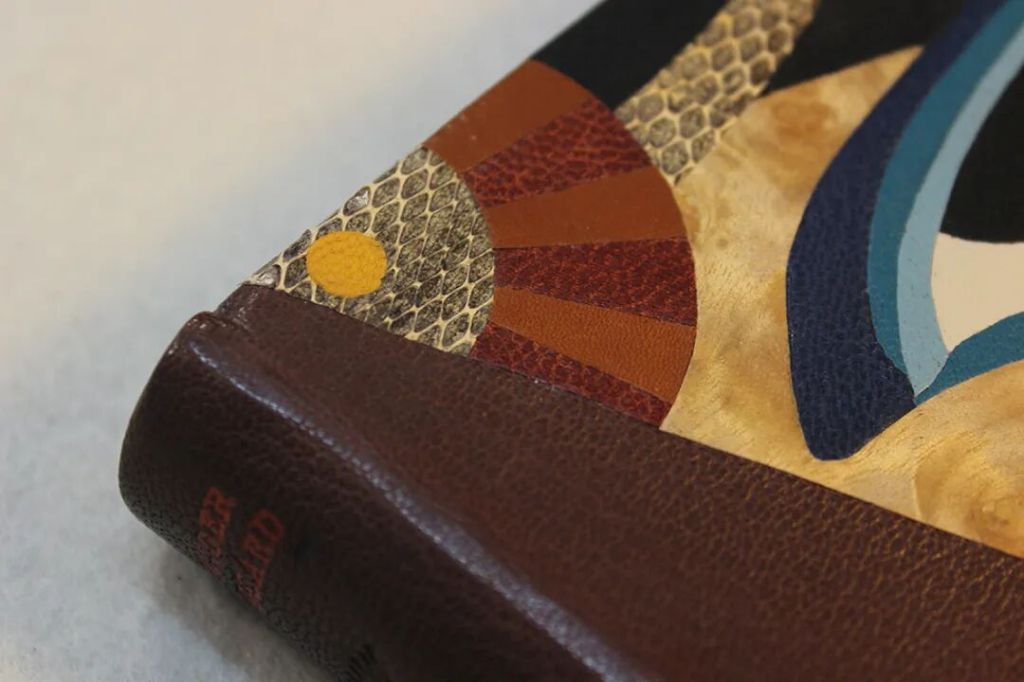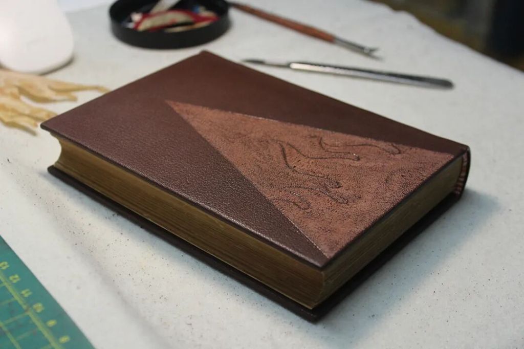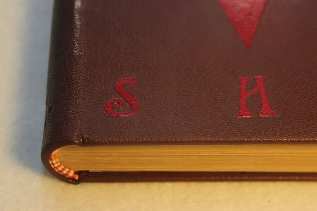 和人体一样,书的”脊椎“是结构中最重要的部分,因此书脊的处理总是费时费力:不断确认,不断打磨。紫褐色的山羊皮是我们一开始就选好的材料,包覆整个书脊和封面,“延伸”到内侧合页处,在封面封底内部形成边框,这也是一种比较精致的装帧形式,只在某些全皮精装中使用。