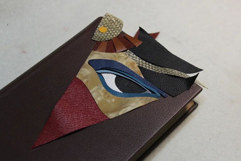 左右滑动观看皮面镶嵌过程与客户敲定设计稿之后,就进入备料和制作阶段。这次的镶嵌材料,除了山羊皮、小牛皮,还有鱼皮和木皮等,我打算在木皮上用电热笔作画,所以前期做了不少试验。天然木皮树瘤细节很多,我专门挑选适合设计稿的天然图案,分别使用在封面和封底,封底烫印一张枯槁的脸,与封面鲜活的人物形象对比强烈。