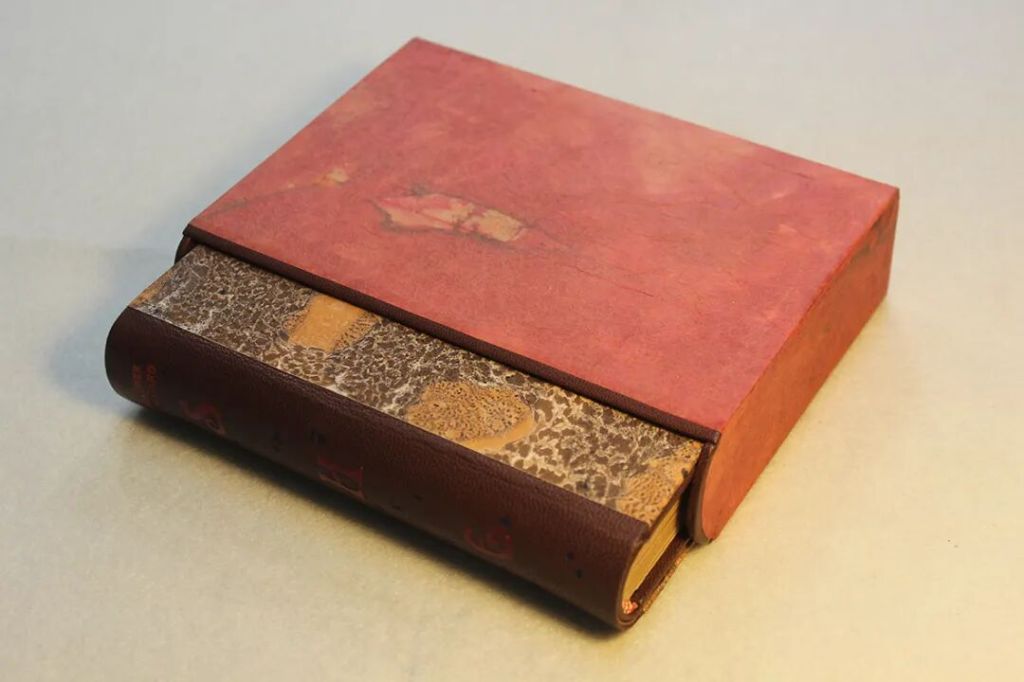 然后,我为这本书制作做了包封和书函。包封用纸与环衬相同,来自我最爱的大理石纹纸艺术家Marianne Peter,她最擅长神秘气氛和力量的渲染,书脊上的贴皮书名与封面相同,只变作竖排。书函裱纸是专门为这本书染制的,经过好几次试染之后,终于得到我想要的绛红色和肌理感,随机出现的奇妙图形,则是意料之外的惊喜。