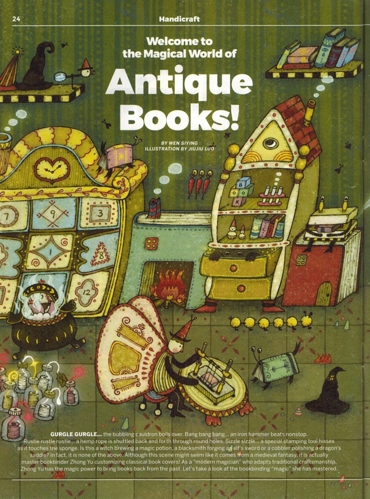 “咕噜噜噜……沸腾的铁锅热气腾腾地冒着泡泡;咚、咚、咚……铁锤在不停地敲打;沙沙、沙沙……麻绳在圆孔间来来回回地穿梭;滋啦滋啦……特制烫金工具在海绵上嘶嘶作响。这究竟是女巫在熬制魔药,还是铸剑师在为精灵锻造宝剑,抑或是皮匠在打磨龙鞍?这幅布满中世纪魔法元素的画面,其实,是古典装帧师钟雨在为书籍定制外衣!作为传承了古典手艺的“现代魔法师”,钟雨拥有让书籍穿越时空的魔力。下面我们就一起瞧瞧,她掌握的“装帧法术”有哪些吧!”