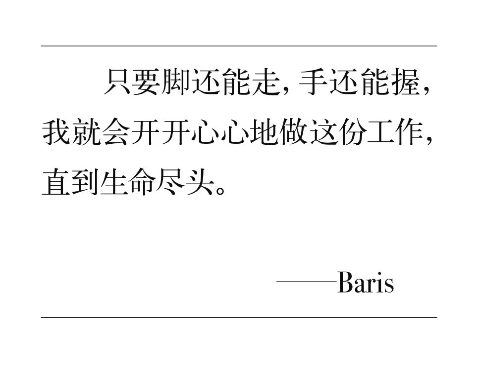Baris每天上午11点开始工作,在任何想停止的时候停下来,但晚餐后,或午夜,如果白天的工作没有结束,或者突然想到了什么,他也常返回工作室继续干活。“工艺师”(artisan)存在于“工人”(worker)和“艺术家”(artist)之间,这个身份令他非常自在,“我不会想太多,我从工作中寻找灵感。”他毫不掩饰对自己职业的自豪,在2017年接受Art & Métiers du Livre(书籍工艺美术)杂志采访时,Baris说:“在我心目中,比起只注重概念的纯艺术,手工艺更高尚,因为它不仅美丽,而且有用——我喜欢这样!”截至采访时,他已经制作超过6000张纸,这些美丽的大理石纹纸,被精心地使用在书本、函盒、折纸、扇面、墙面内饰……或者直接被装裱、张贴起来。