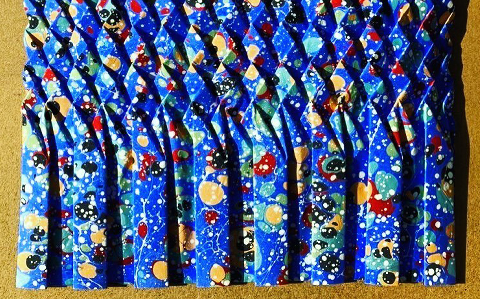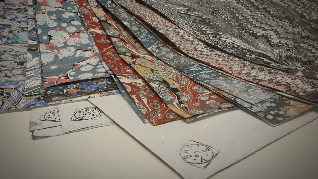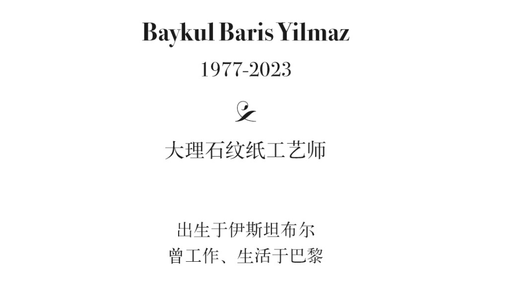 Baykul Baris Yilmaz原是子承父业的土耳其厨师,22岁时来到法国,在餐厅工作了18年。他在家乡学到的除了厨艺,还有绘制大理石纹纸。白天做菜,晚上做纸,做纸的名声渐渐超过了做菜。传统土耳其技艺加上鲜明的个人风格,Baris在巴黎装帧师之间的名声越来越大,他的纸出现在各个装订工坊的作品中。就这样,他终于辞掉原本的工作,开设了巴黎唯一的一家专业大理石纹纸工作室。