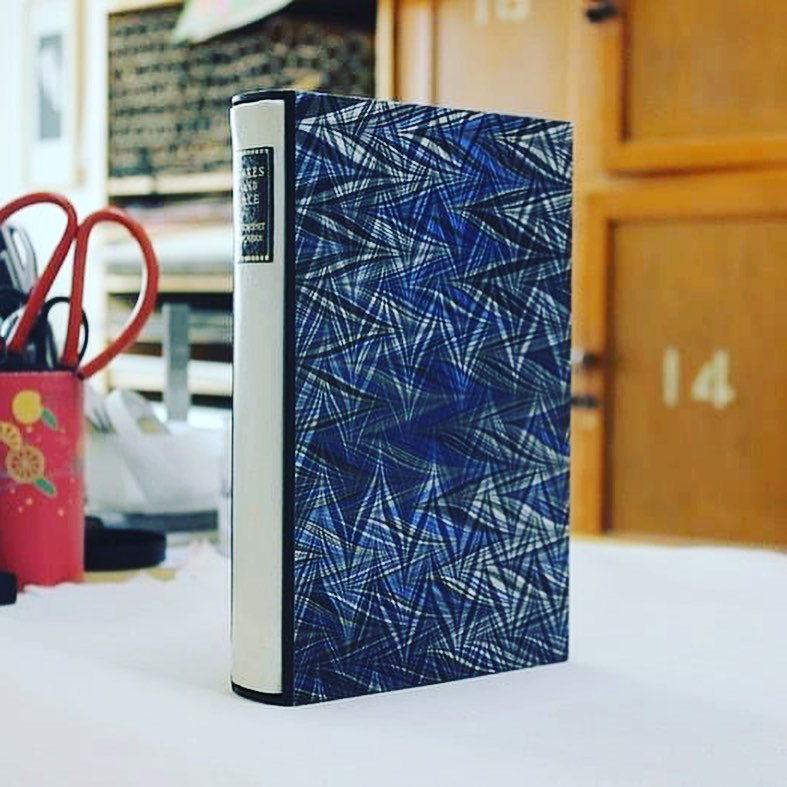 我用Baris的纸做过一个圆口书函,承装一本经过修复的毛姆小说。这是一张双层印染的人字纹图案大理石纹纸,将同样的图案90度交错,在二维空间形成的视觉立体感,十分迷幻。