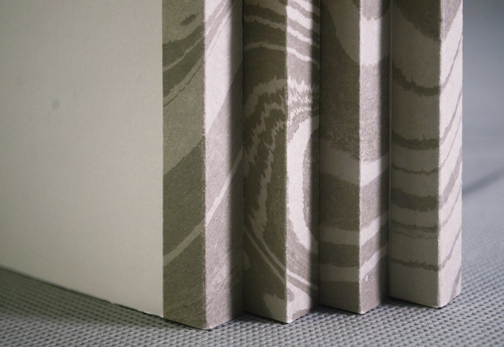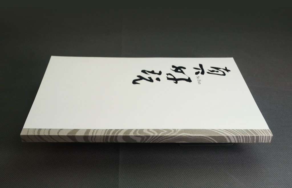 本书以“艺术家书”的形式呈现,在内容,设计、用材和工艺等的配合上十分讲究,印量仅140册。它不仅是一场“纸上展览”,也有艺术家本人近年创作的诗歌、联语和少量画作,与甲骨文字相映成趣。以手工墨流纸制作“腔背装”书脊,每本都不相同。