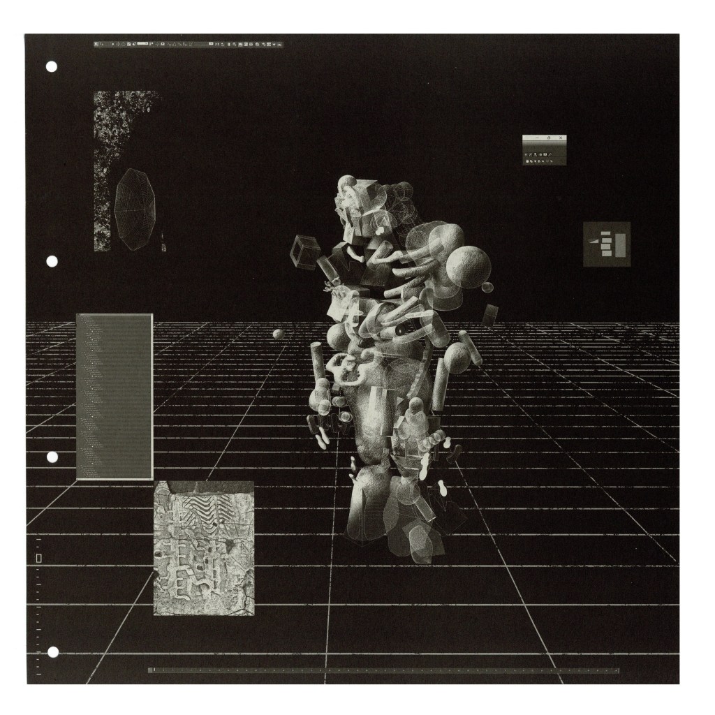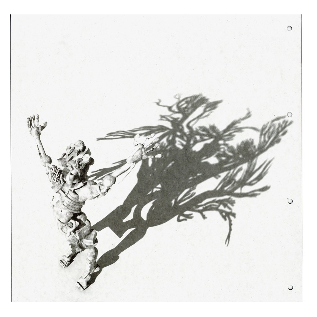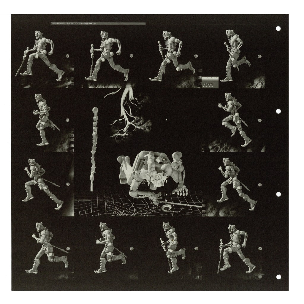 一开始,小龙花用绘图软件像搭积木一样搭建出夸父的形象,这个模型每换一个角度,就成为意外之喜,它的成像效果类似平面里的三维,和专业三维软件的准确建模完全不同,而这种不准确刚好是艺术家想要的。在最终的画面中,夸父的形体从无到有,过程里的每个阶段,身体在不同光线下呈现不同的质感,最终像岩石般坚硬。他向太阳展开双臂时,身后却投下一棵树影。